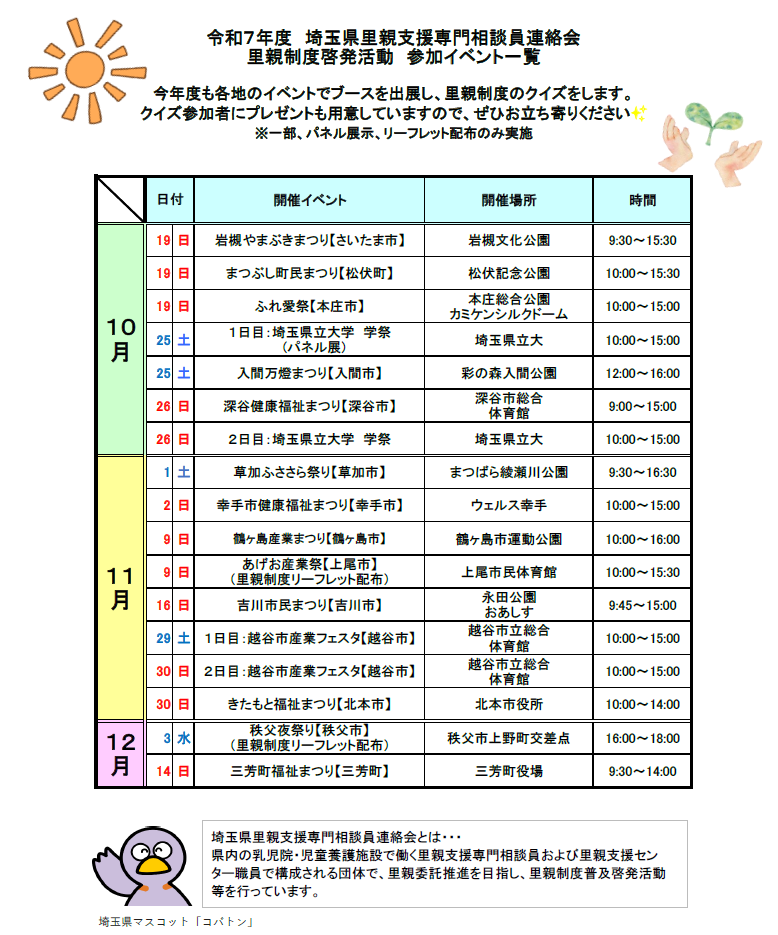 埼玉県内の児童養護施設や乳児院で働く里親支援専門相談員を中心に、各地のお祭りで里親制度の広報活動をさせていただきます。