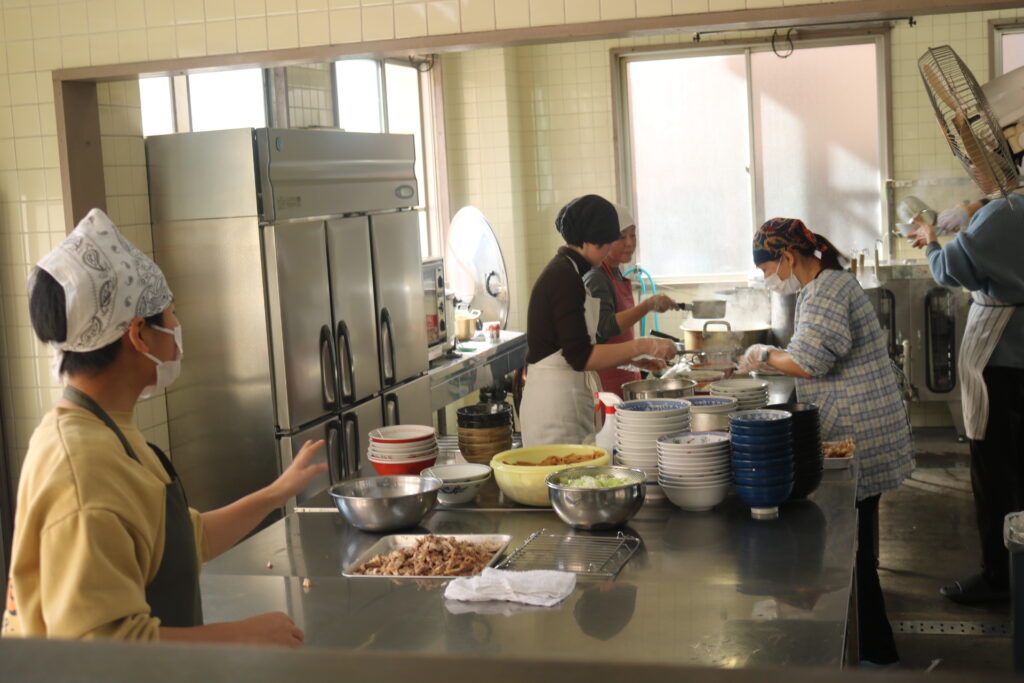 厨房では忙しそうに作業している栄養士さん、お手伝いの職員さん