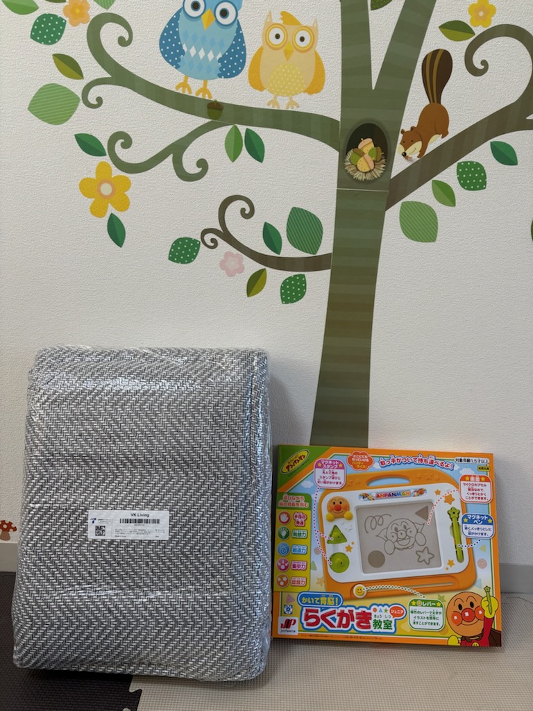 川越様よりアンパンマンの玩具とリビングマットをいただきました。