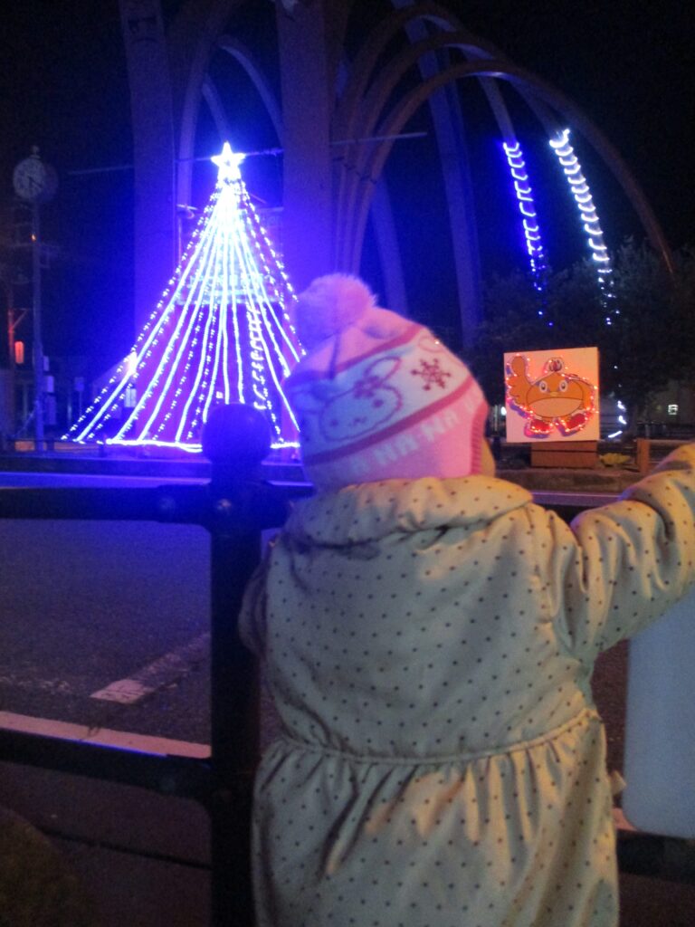 少し離れた場所からイルミネーションを見つけると「あれなんだろう」「青色だ。青色好きなんだー」と興味津々。