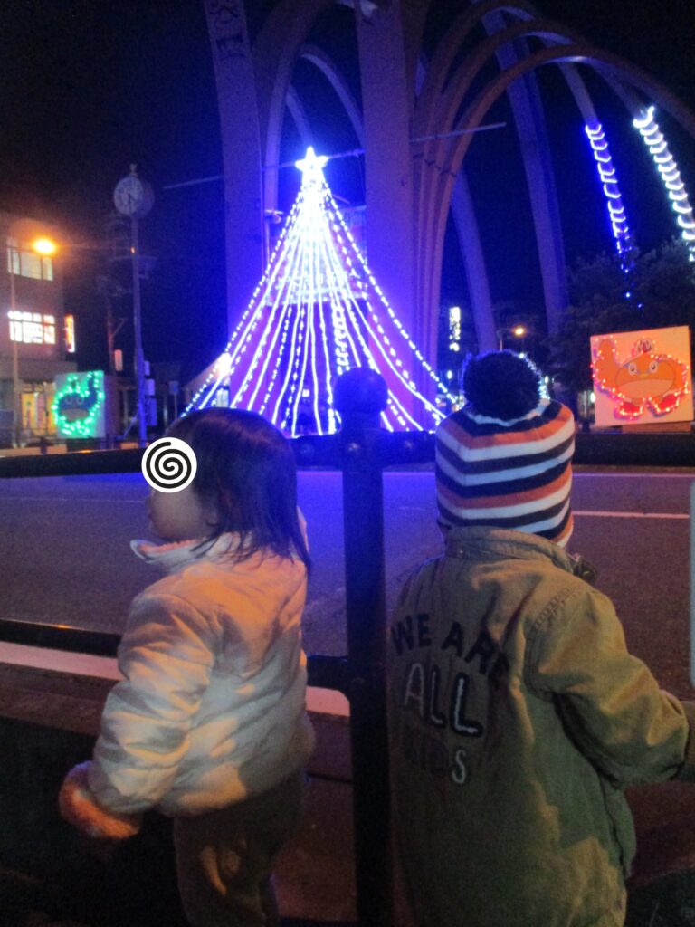 夜のお散歩で駅前のイルミネーションを見に行きました。