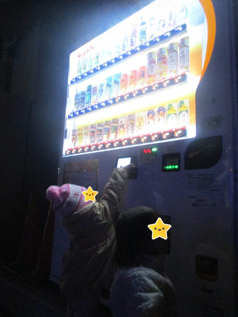 見るのに満足した後は自動販売機で温かいおしるこを買い、部屋まで大事に手に持って帰りました。部屋に戻りおしるこを飲みながら「ぴかぴかだったね」「また行きたいね」と楽しそうに話していました。